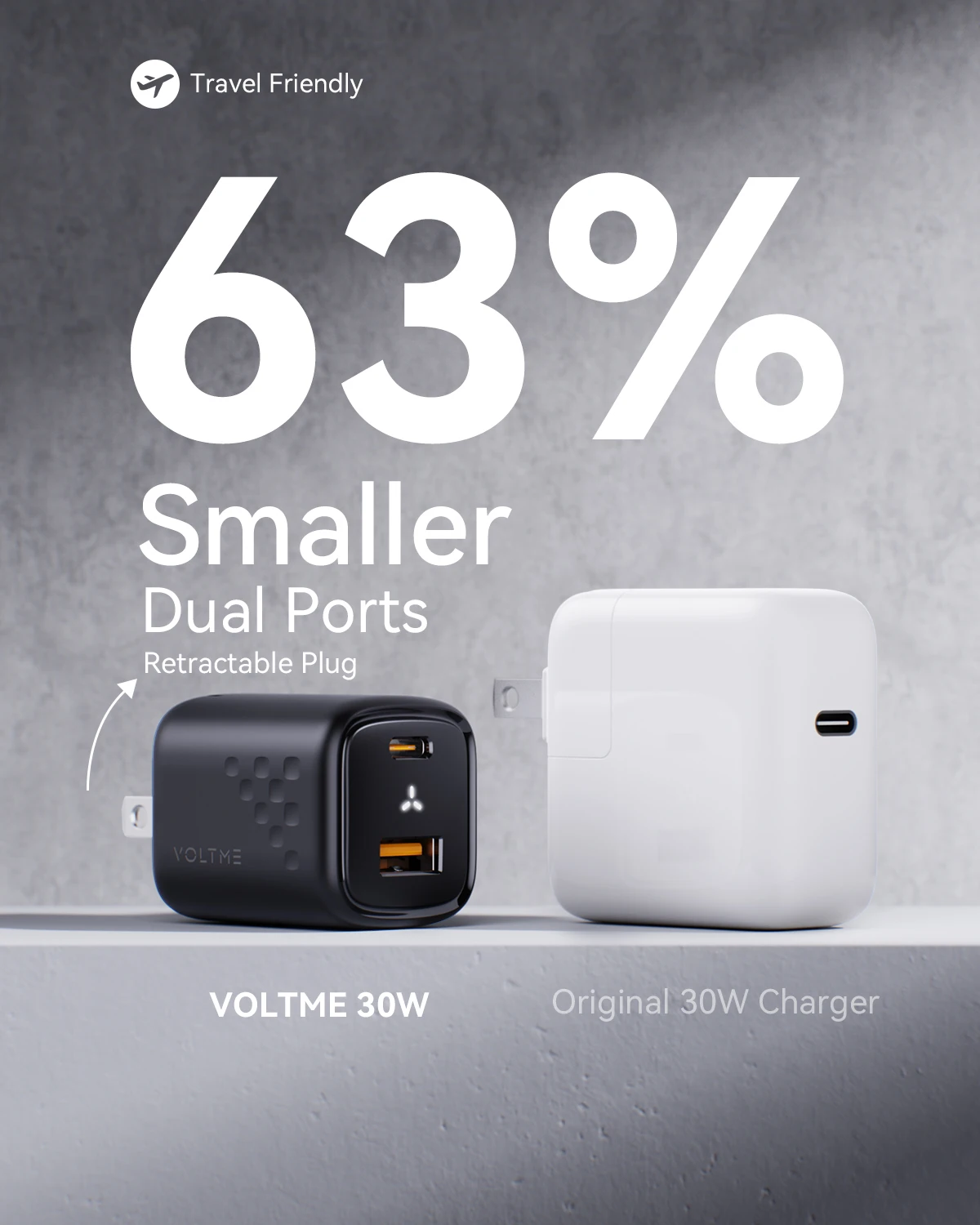 VOTME 30W 2-in-1 Charger takes less space (63% smaller) while retaining the same power! The pronge plug is foldable, it fits easily in your backpack or handbag, has superior portability, perfect for travel, home, and office.