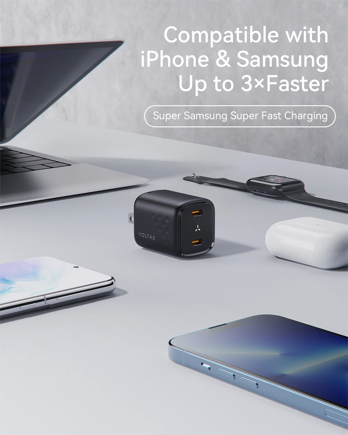 VOTME 30W 2-in-1 Charger takes less space (63% smaller) while retaining the same power! The pronge plug is foldable, it fits easily in your backpack or handbag, has superior portability, perfect for travel, home, and office.